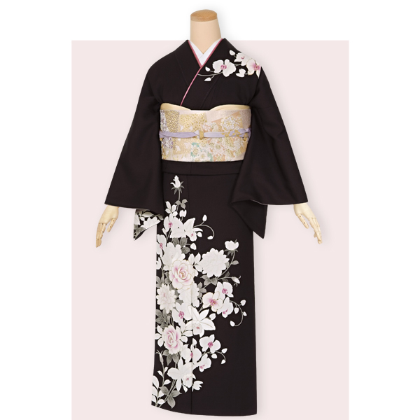 濃い地色にパッと浮かび上がって白牡丹と胡蝶蘭がなんともエレガントで素敵にお召いただけます。