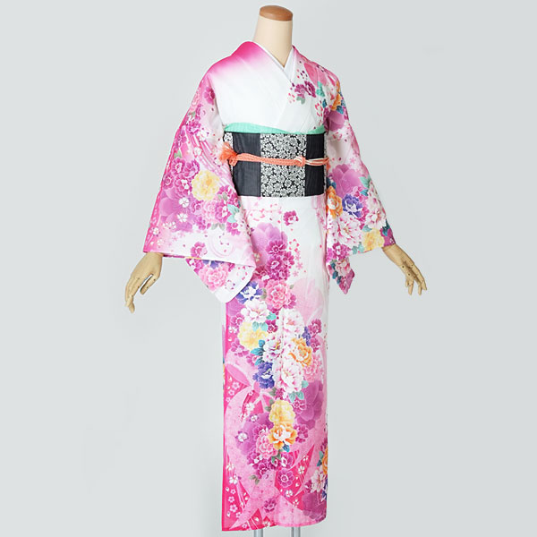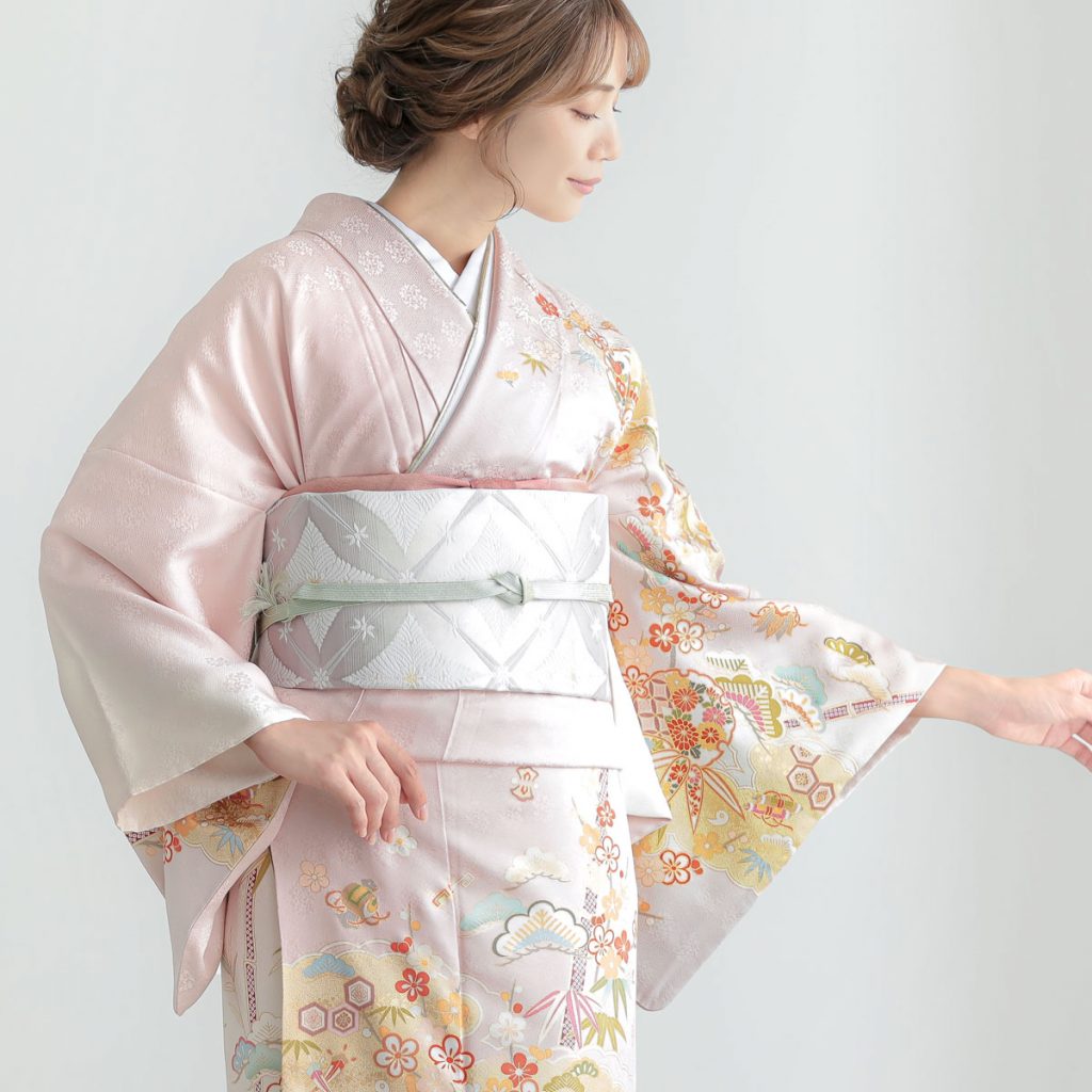 - 帯:白の袋帯 / 帯揚げ:ピンク / 帯締め:淡いグリーン / 草履・バッグ:銀