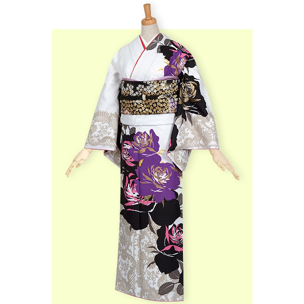 帯:ラメ単色の袋帯 / 帯揚げ:オフホワイト / 帯締め:白×金 / 草履・バッグ:黒×シルバー
