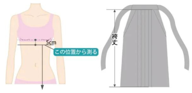 お子様にまっすぐ立っていただき、アンダーバストの5センチ下から真っ直ぐ下にメジャーをおろして、袴丈を測ります。袴の長さは履物、好みによって調整をしてください。こだわりがない場合はお勧めの袴丈を参考にしてくださいね!