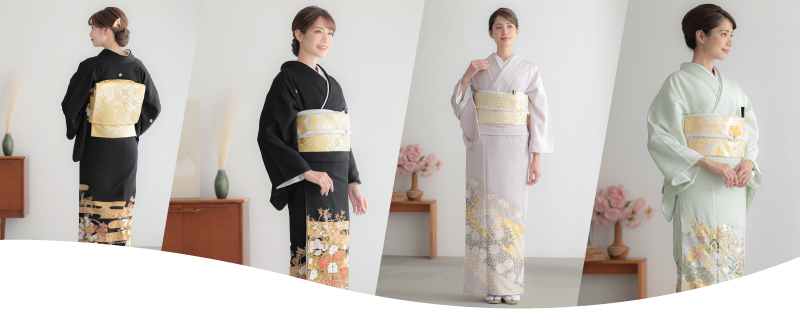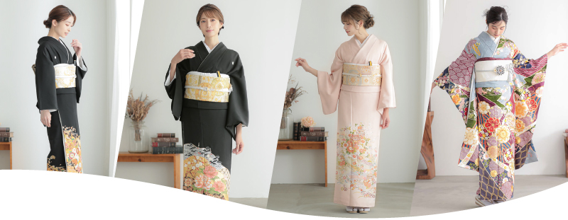 女性用の着物には、主に黒留袖、色留袖、訪問着、振袖があります。それぞれ、色、形、柄がつく部分が異なります。そして、それぞれの着用できる人、格が異なってきます。