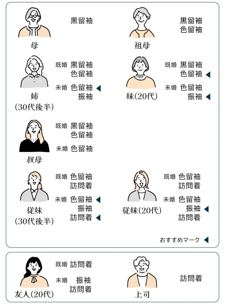 - 立場別(母親・祖母・叔母・姉妹・従姉妹・友人)のふさわしい着物の種類
