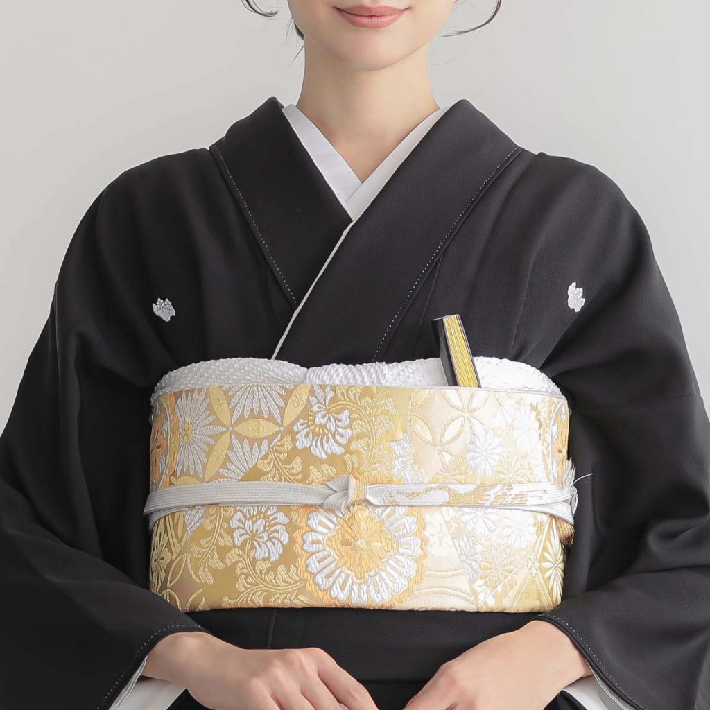 留袖を着る際には、末広(すえひろ)と呼ばれる白い扇子を帯に差します。実際に開いて使うものではなく、礼装の格を示す飾り小物です。「末広がり」=末永く繁栄するという縁起のよい意味があり、結婚式などの慶事には欠かせません。